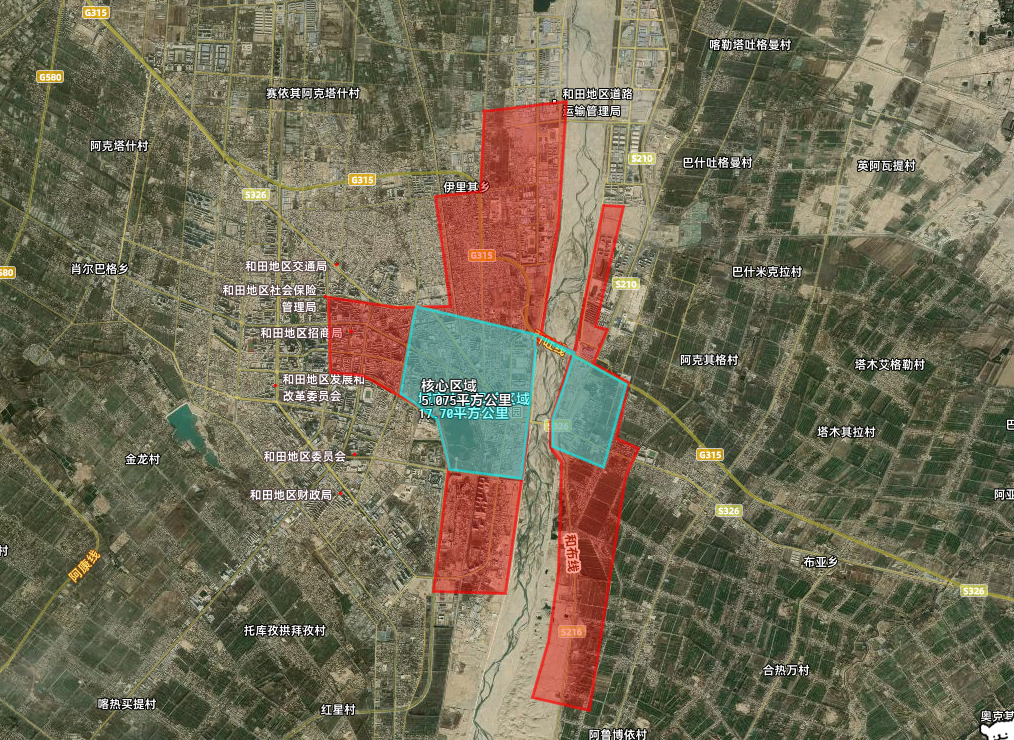 选取河西区:西至古江南路、南至昆仑路、东至滨河路、北至玉河街道片区与二桥连接处;河东区:西至玉龙喀什河沿线、南至一桥南延300米范围、东至玉龙喀什河东延1公里范围、北至二桥,区域范围5平方公里。