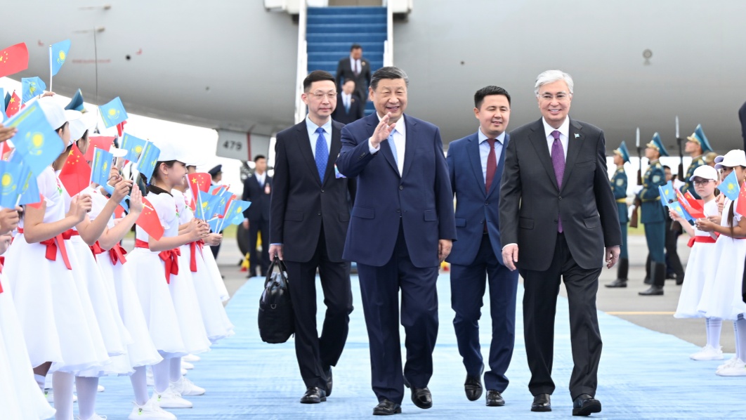 专机抵达阿斯塔纳纳扎尔巴耶夫国际机场时,哈萨克斯坦总统托卡耶夫率政府第一副总理斯克利亚尔、副总理兼外长努尔特列乌、总统外事顾问卡济汉、阿斯塔纳市长卡瑟姆别克等高级官员热情迎接。身着盛装的哈萨克斯坦女青年向习近平献花。
