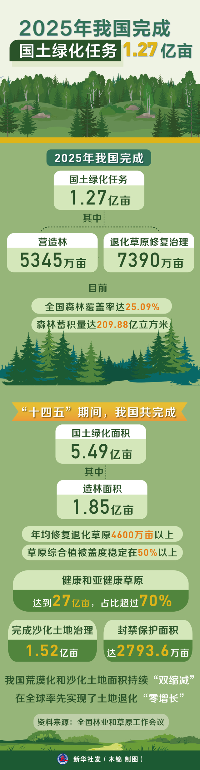 记者1月15日从全国林业和草原工作会议上获悉,2025年我国完成国土绿化任务1.27亿亩,其中营造林5345万亩,退化草原修复治理7390万亩。目前全国森林覆盖率达25.09%,森林蓄积量达209.88亿立方米。