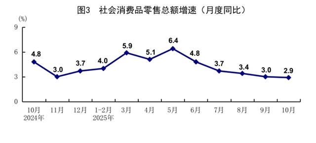 10月份,社会消费品零售总额46291亿元,同比增长2.9%;环比增长0.16%。按经营单位所在地分,城镇消费品零售额40021亿元,同比增长2.7%;乡村消费品零售额6270亿元,增长4.1%。按消费类型分,商品零售额41092亿元,增长2.8%;餐饮收入5199亿元,增长3.8%。基本生活类和部分升级类消费较快增长,限额以上单位粮油食品类、通讯器材类、文化办公用品类、体育娱乐用品类商品零售额同比分别增长9.1%、23.2%、13.5%、10.1%。1—10月份,社会消费品零售总额412169亿元,同比增长4.3%。全国网上零售额127916亿元,同比增长9.6%。其中,实物商品网上零售额103984亿元,增长6.3%,占社会消费品零售总额的比重为25.2%。1—10月份,服务零售额同比增长5.3%,增速比前三季度加快0.1个百分点。其中,文体休闲服务类、通讯信息服务类、旅游咨询租赁服务类、交通出行服务类零售额较快增长。