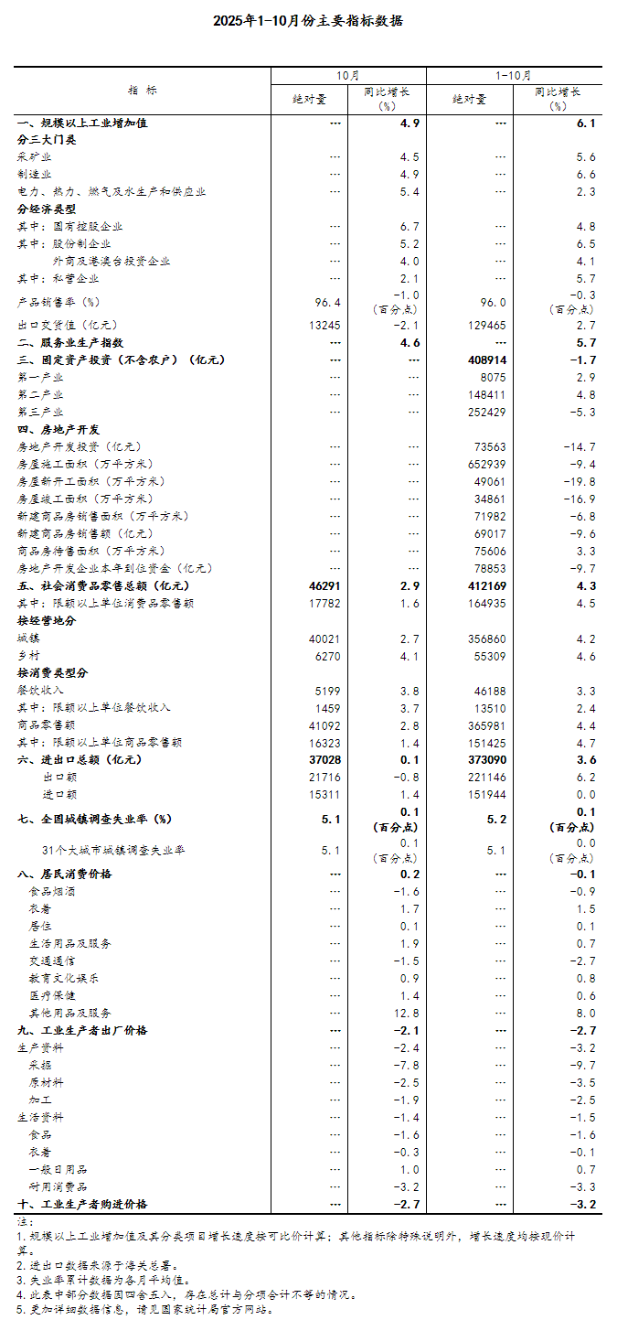 总的来看,10月份国民经济运行总体平稳,转型升级扎实推进,发展新动能继续壮大。也要看到,外部环境不稳定不确定因素较多,国内结构调整压力较大,经济平稳运行面临不少挑战。下阶段,要坚持以习近平新时代中国特色社会主义思想为指导,深入贯彻落实党的二十届四中全会精神,坚持稳中求进工作总基调,全方位扩大国内需求,着力稳就业、稳企业、稳市场、稳预期,积极推动宏观政策持续落地增效,全面深化改革开放,进一步强化创新驱动,促进经济质的有效提升和量的合理增长。