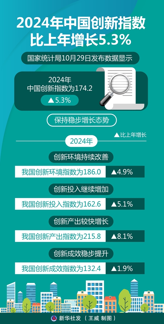 国家统计局10月29日发布数据显示,2024年中国创新指数为174.2,比上年增长5.3%,保持稳步增长态势。