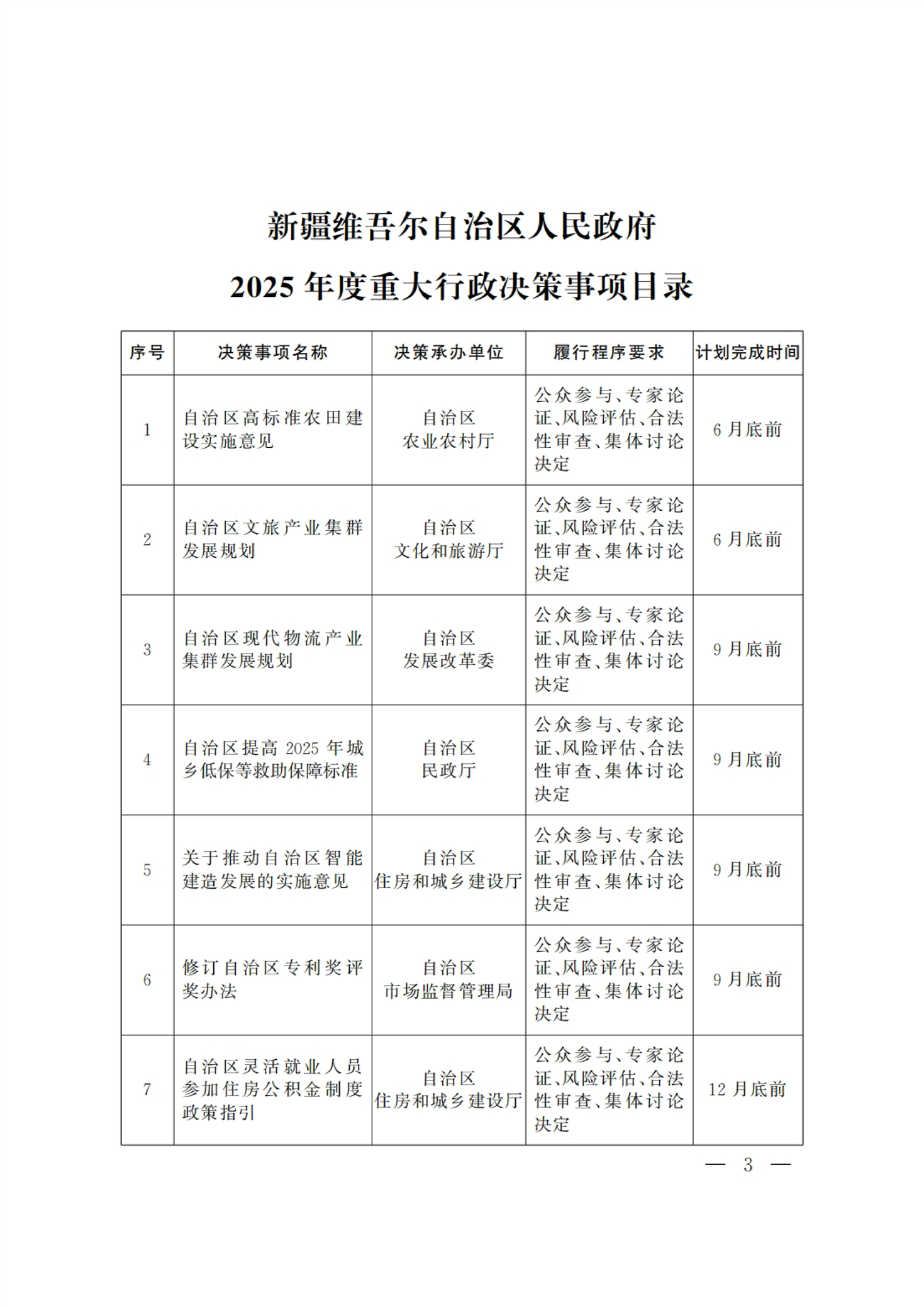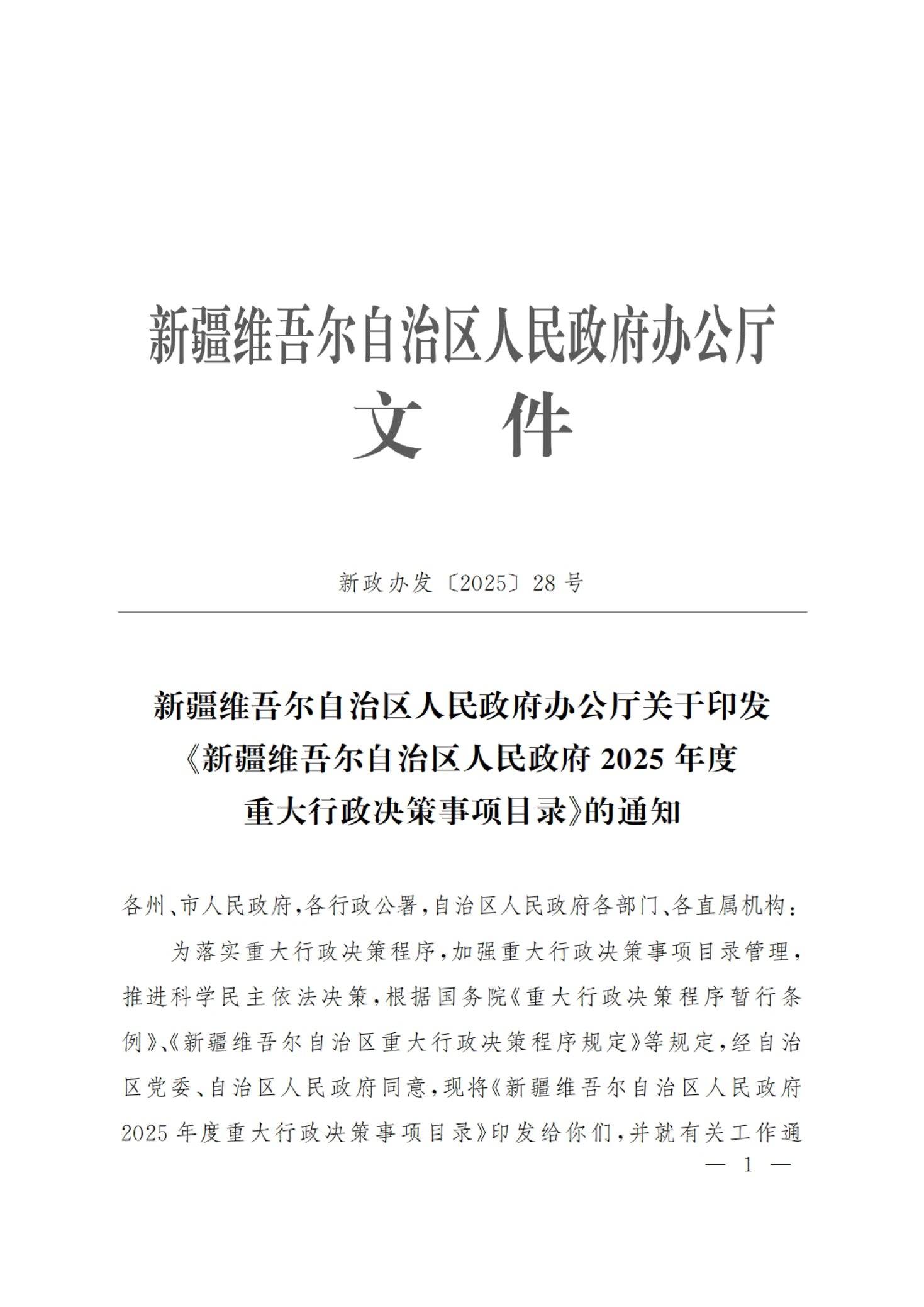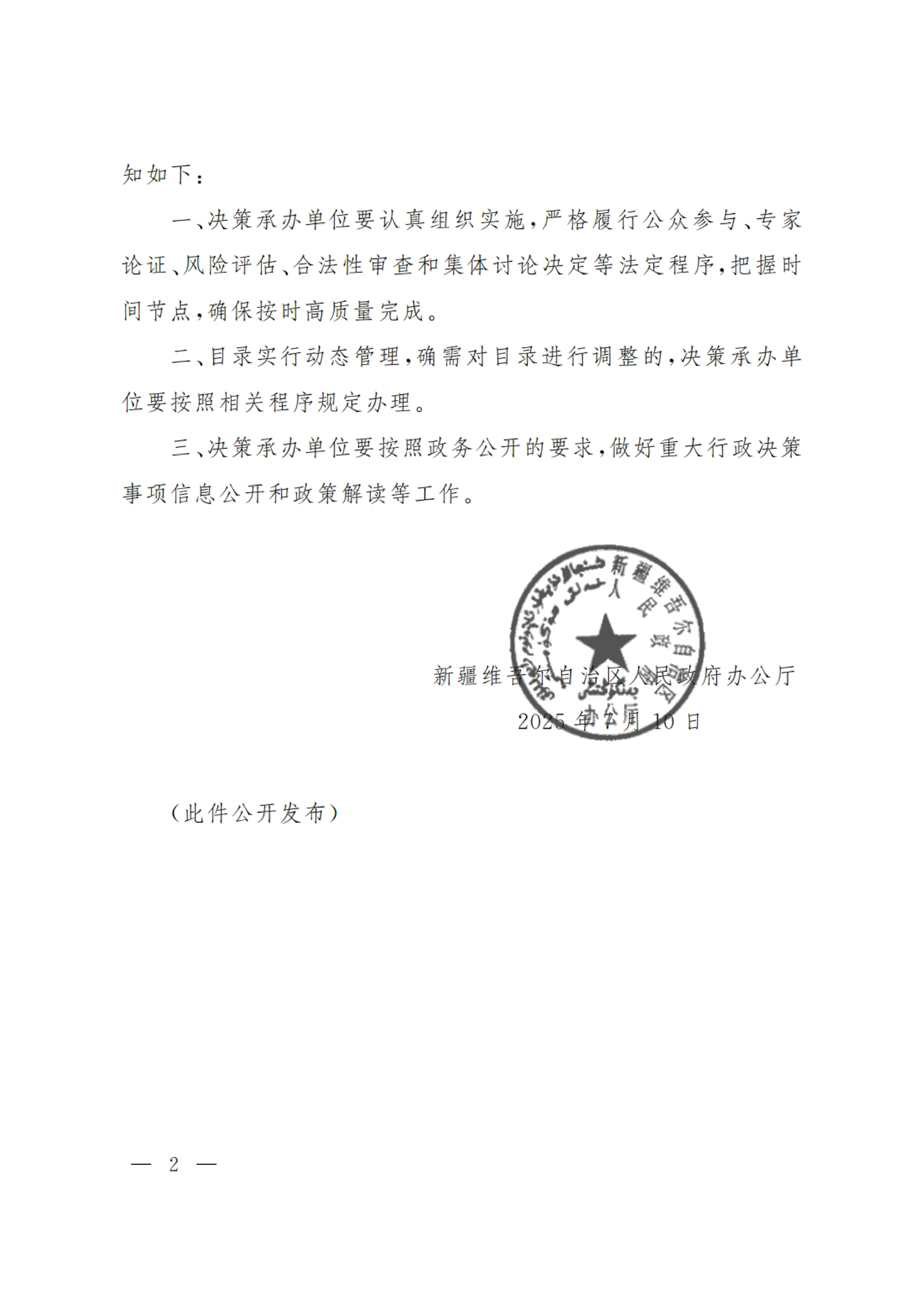 新疆维吾尔自治区人民政府办公厅关于印发《新疆维吾尔自治区人民政府2025年度重大行政决策事项目录》的通知